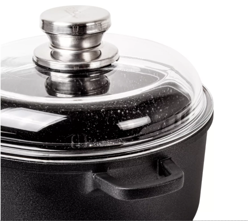 Корпусът е изработен от лят алуминий, който осигурява ефективно и равномерно разпределение на топлината. Това спомага за по-добър контрол по време на готвене и равномерна термична обработка на продуктите.